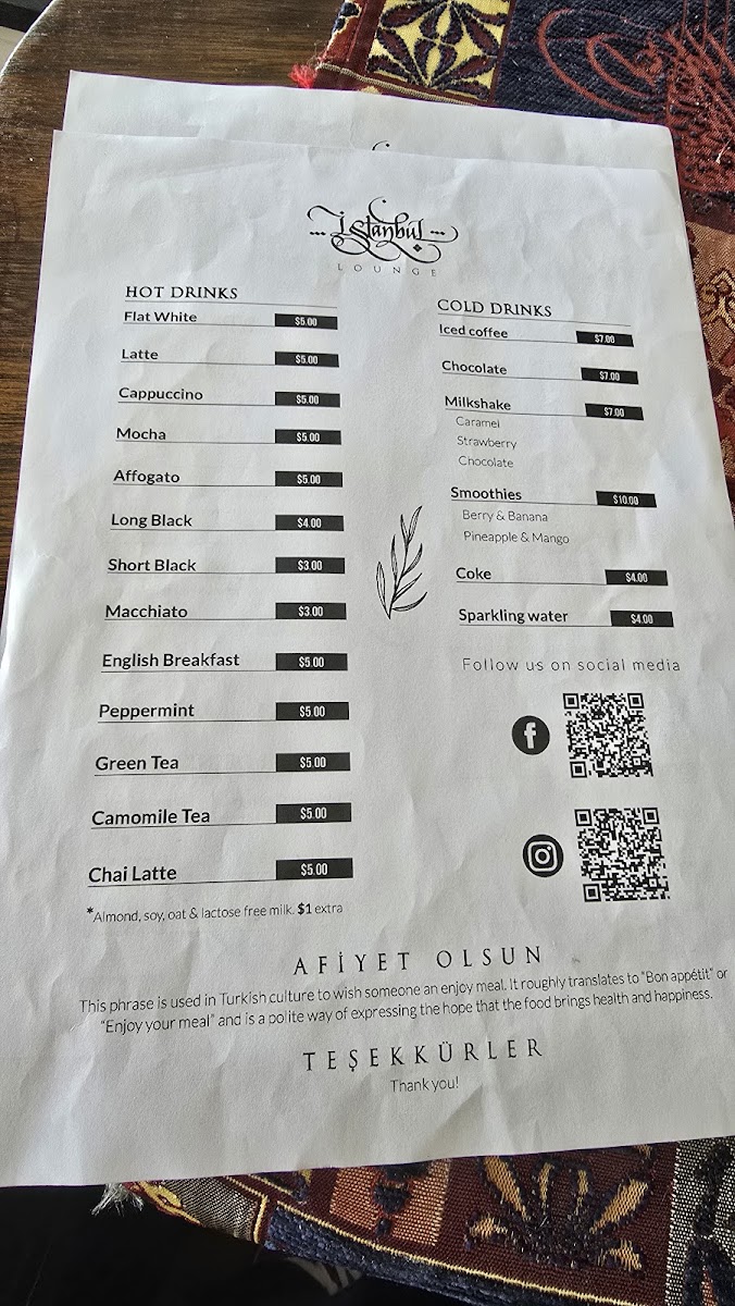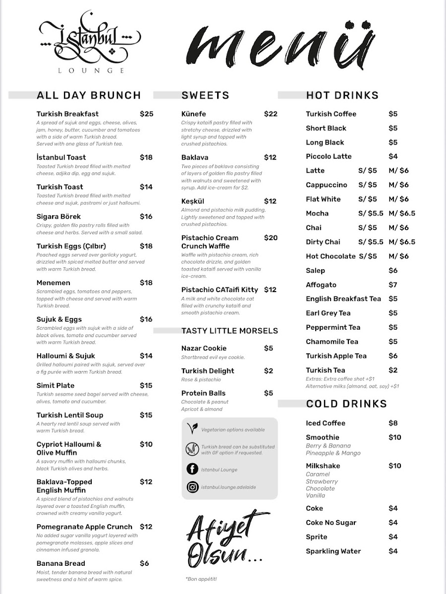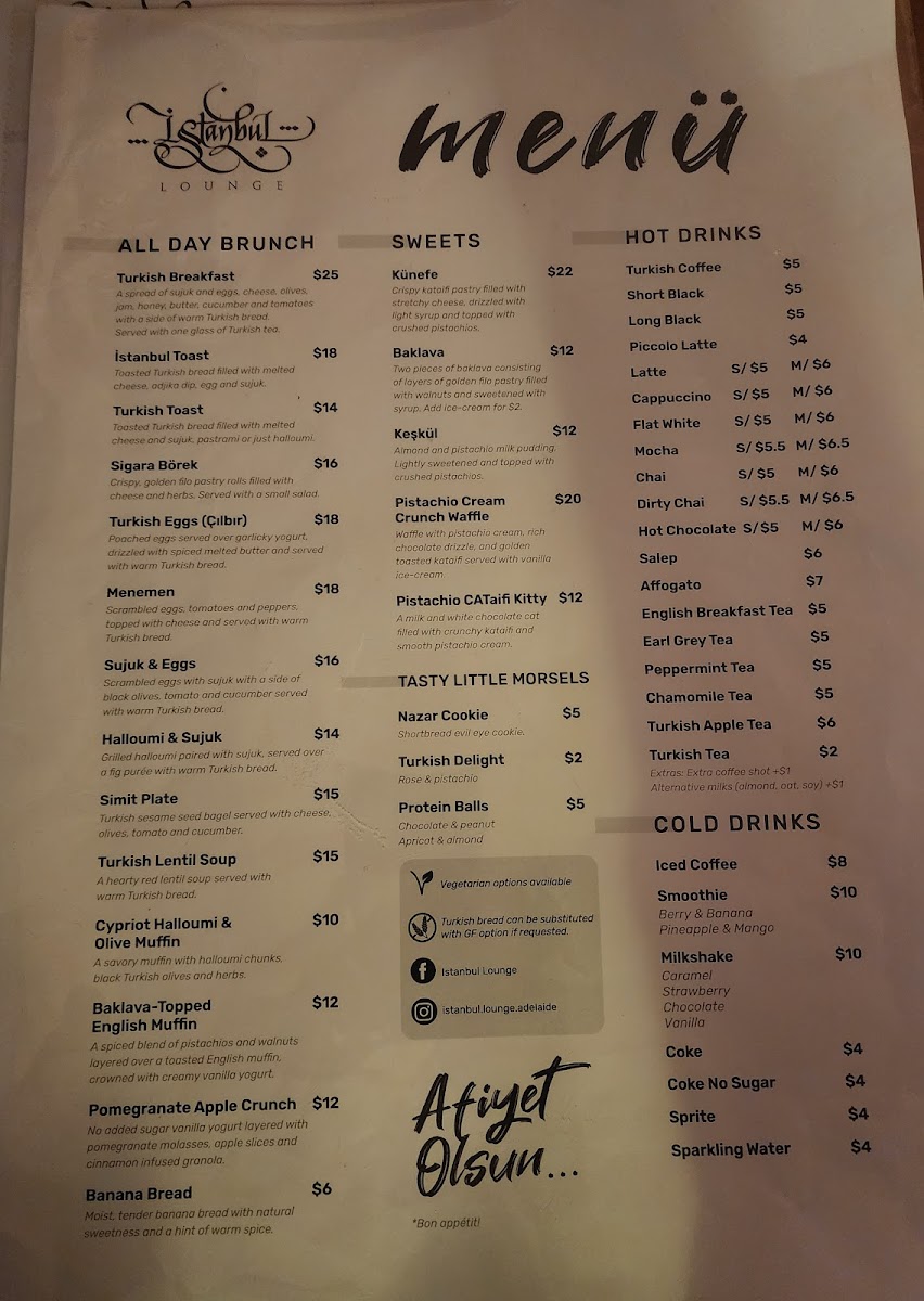 The menu at Istanbul Lounge offers a delightful variety of Turkish and international flavors, catering to all tastes. For dessert lovers, there’s an array of sweet treats including Pistachio Baklava, Walnut Baklava, Turkish Delight Cheesecake, and the unique Turkish Delight Waffle. A few more options include Lokum and Künefe, alongside classic favorites like Baklava and Keşkül. The coffee selection is perfect for those seeking a caffeine fix, with options such as Flat White, Latte, Cappuccino, Macchiato, and Short Black. For something richer, try the Turkish Coffee or a Long Black. If you’re in the mood for something different, they also offer Hot Chocolate and the traditional Salep. Tea enthusiasts can enjoy refreshing Turkish Tea, English Breakfast, Green Tea, Camomile, and the sweet Turkish Apple Tea. When it comes to brunch, the restaurant serves satisfying dishes like the Turkish Breakfast, İstanbul Toast, and Sigara Börek. You can also indulge in Turkish Eggs or the delicious Turkish Toast. For a light snack, Nazar Cookies, Turkish Delight, and Protein Balls are ideal. A selection of cold drinks, such as Coke No Sugar, rounds out the menu, ensuring there’s something for everyone at Istanbul Lounge.