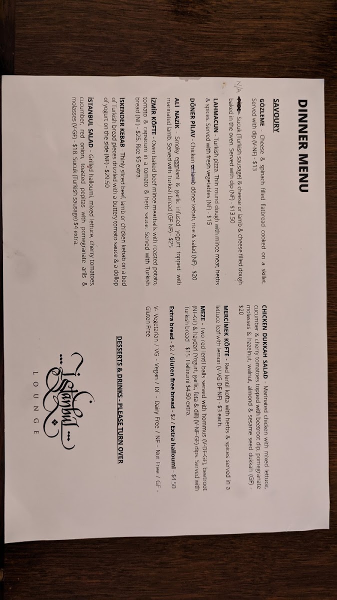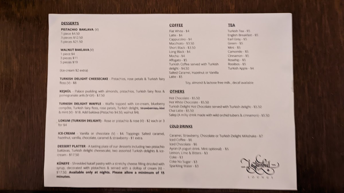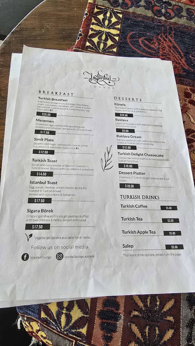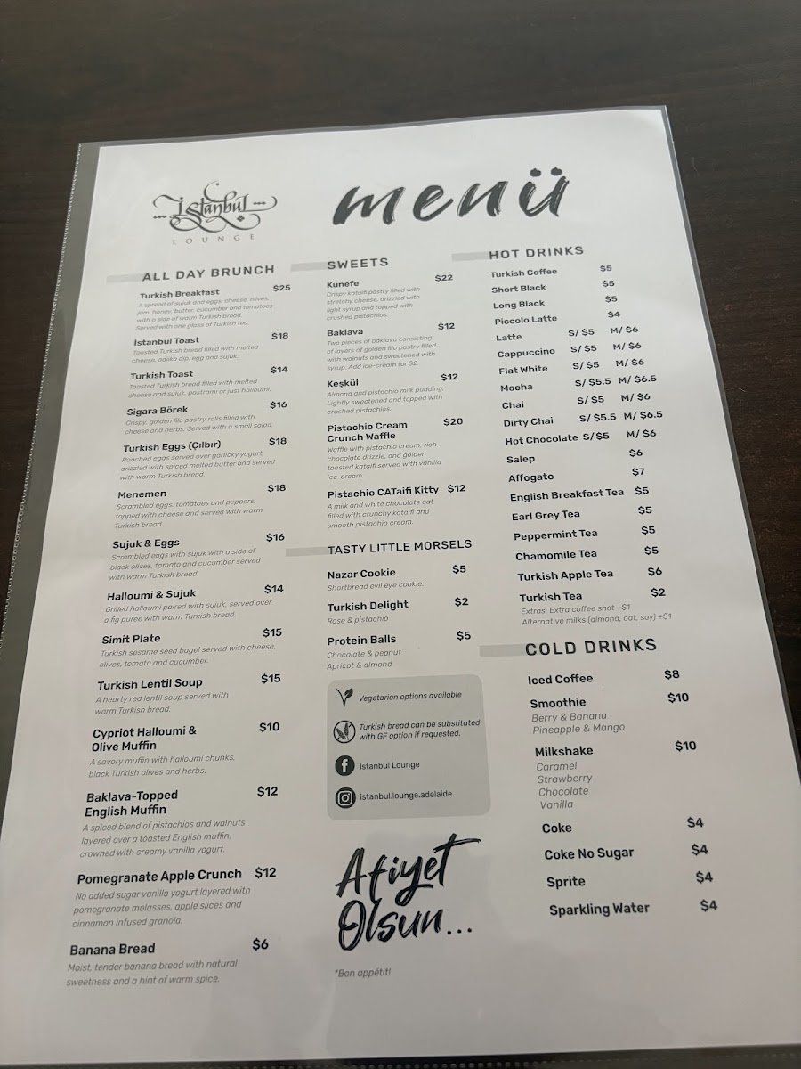 The menu at Istanbul Lounge offers a delightful variety of Turkish and international flavors, catering to all tastes. For dessert lovers, there’s an array of sweet treats including Pistachio Baklava, Walnut Baklava, Turkish Delight Cheesecake, and the unique Turkish Delight Waffle. A few more options include Lokum and Künefe, alongside classic favorites like Baklava and Keşkül. The coffee selection is perfect for those seeking a caffeine fix, with options such as Flat White, Latte, Cappuccino, Macchiato, and Short Black. For something richer, try the Turkish Coffee or a Long Black. If you’re in the mood for something different, they also offer Hot Chocolate and the traditional Salep. Tea enthusiasts can enjoy refreshing Turkish Tea, English Breakfast, Green Tea, Camomile, and the sweet Turkish Apple Tea. When it comes to brunch, the restaurant serves satisfying dishes like the Turkish Breakfast, İstanbul Toast, and Sigara Börek. You can also indulge in Turkish Eggs or the delicious Turkish Toast. For a light snack, Nazar Cookies, Turkish Delight, and Protein Balls are ideal. A selection of cold drinks, such as Coke No Sugar, rounds out the menu, ensuring there’s something for everyone at Istanbul Lounge.